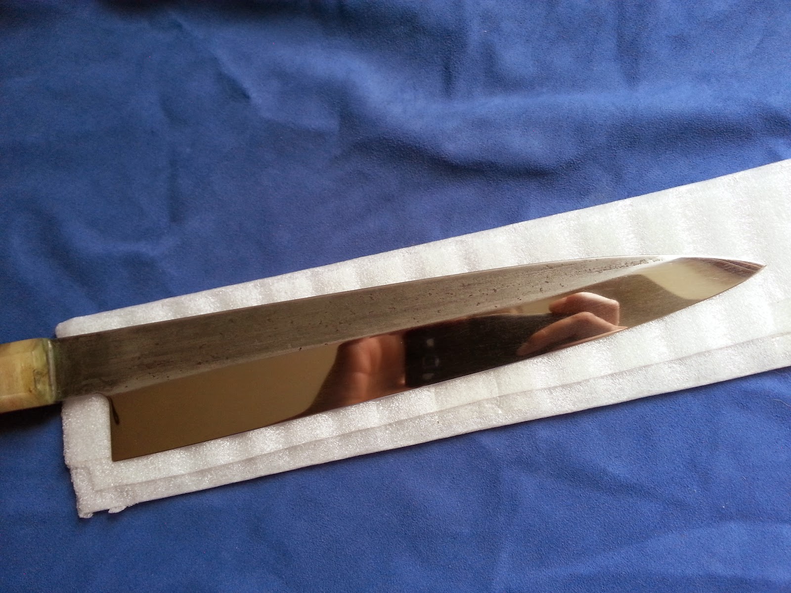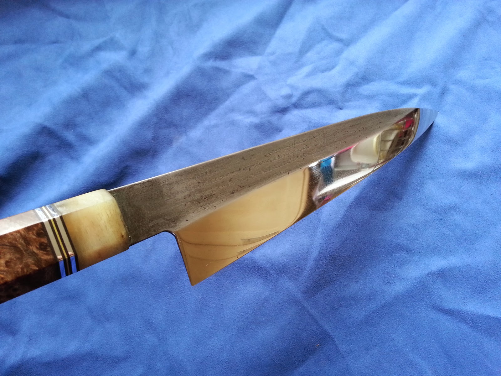 After thinning I had to mirror polish it but it was much harder than I thought. If i could do as much as possible on the stones then it could be quite easy but there was a low spot behind the heel, between flat face of the knife and bevels on the roght side. This is the reason why I had to do that with sanding paper. I thought that polishing this thing will be super easy because I've done that previously with much harder knives than this one but I was wrong. I was sanding it every day except weekends for two weeks!! Yes I know it is crazy but I always left some scratches. When I finished for the first time I've noticed that there are some etching marks and I had to do that again. When I finished with sanding paper I used my mops and polishing compounds. When I was doing that for the last time I started with 80 grit and everytime when I finished with one grit I've done scratches in opposite direction. And when I started with next one I was sanding as long as I could see scratches from previous grit and because of that I could be sure that I removed all scratches. Sounds easy. You know what?? Once again I was wrong. I got it to mirror level but it is getting new scratches super fast. Also after all this sanding and polishing I can still see some scratches and I already done 3 new very visible ones. It seems that I can't get it to perfect mirror finish because I can't make it perfect flat. I told Magnus, owner of the knife, that if he won't like it, then I'll do that all over again.