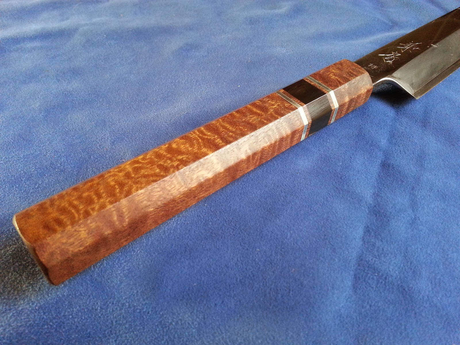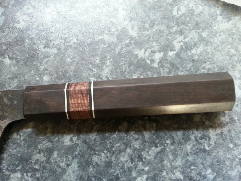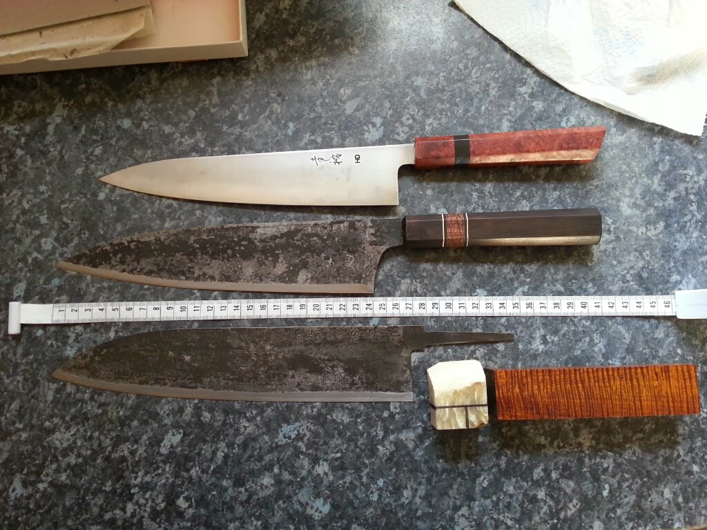 I have to say that I brought a lot of stuff from Denmark. . We got a lot of stuff for free. I bought Yoshiaki Fujiwara Kato Petty 150mm. We made new Cedar wood saya for this one straight away which I got from Bo. Also Maxim gave me two very nice pieces of Ironwood and black ebony to make handles for my Kato's.