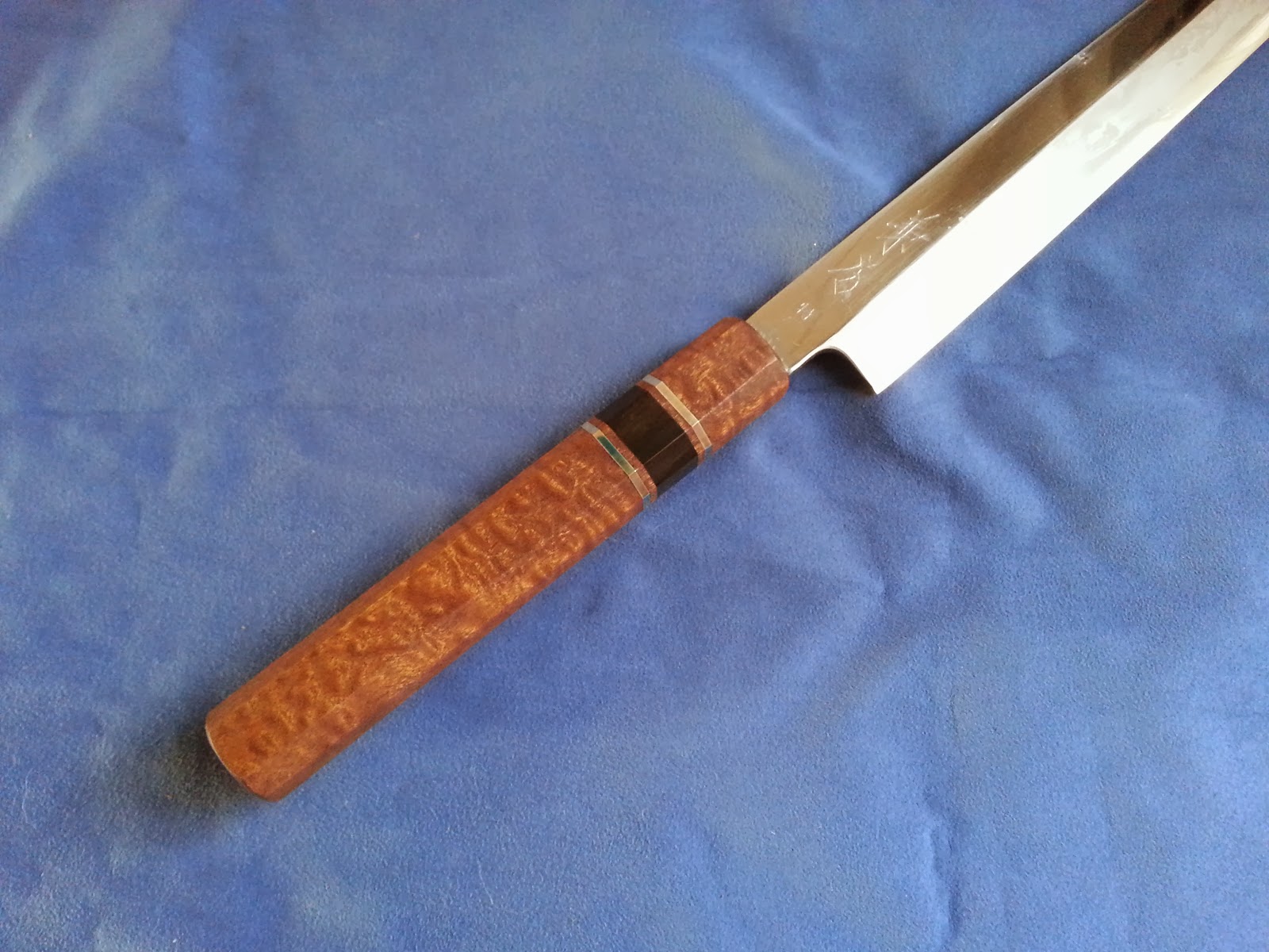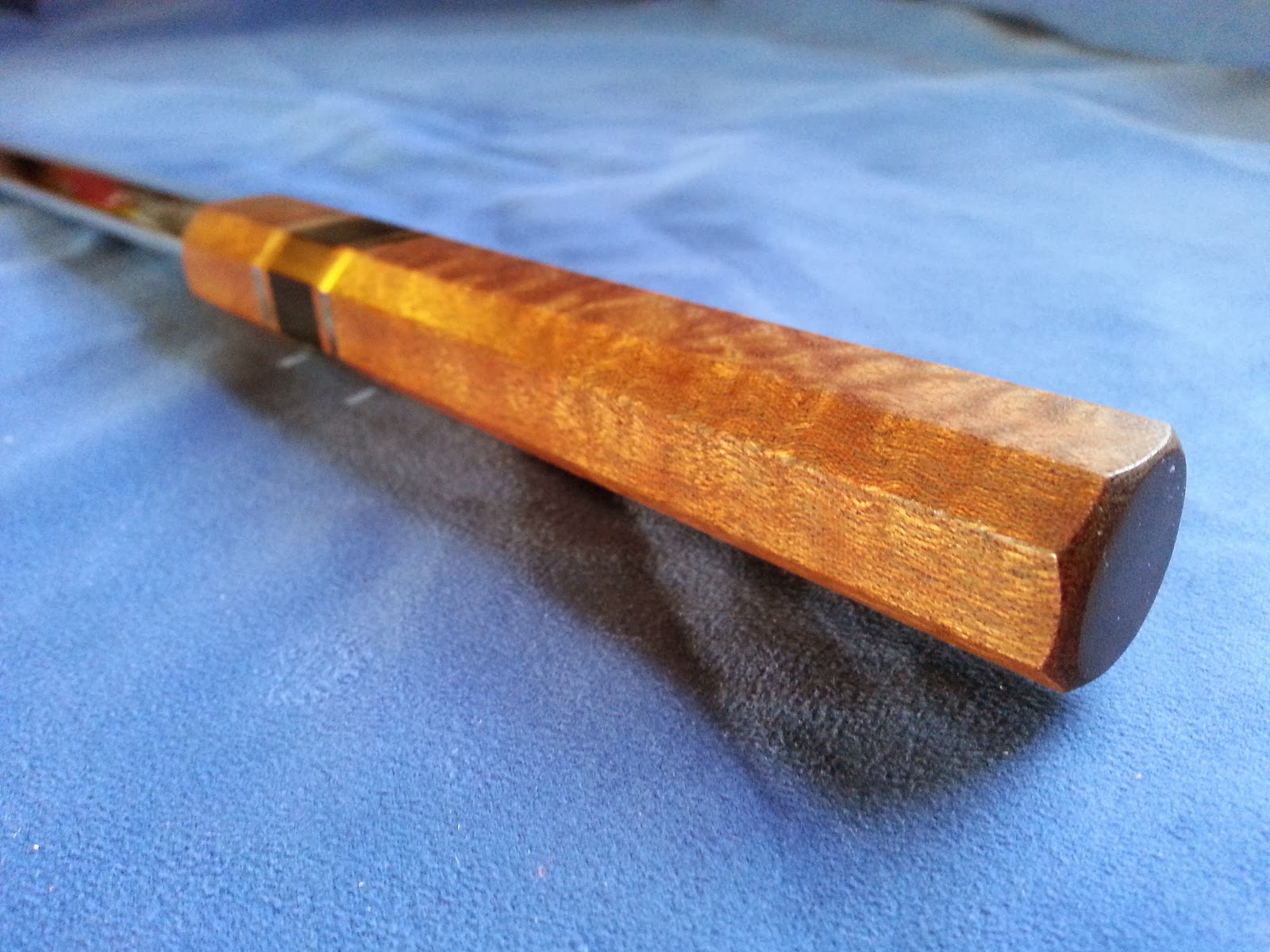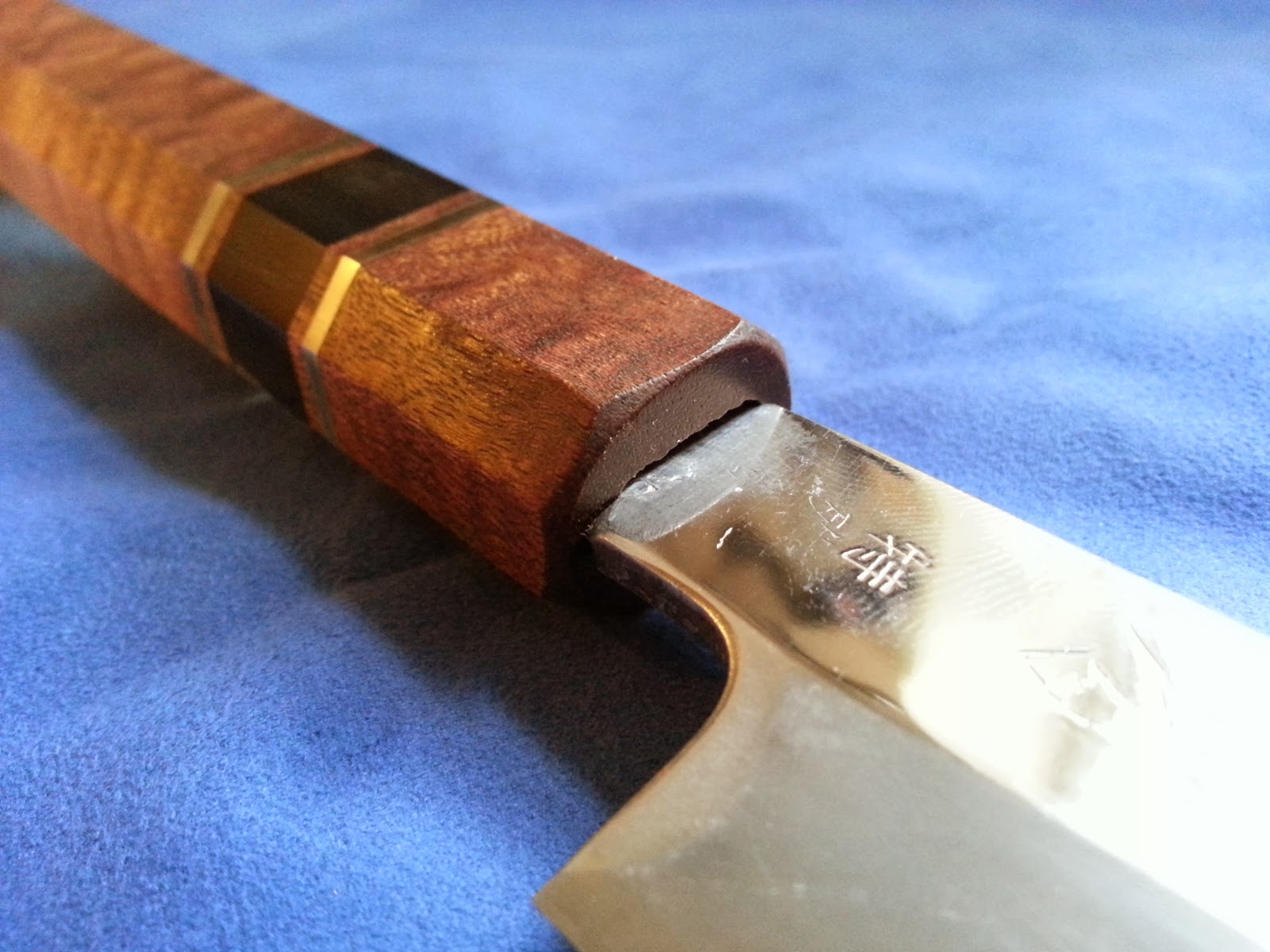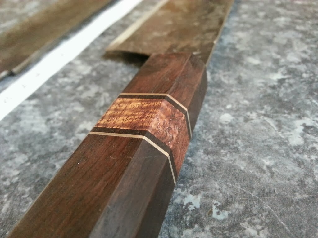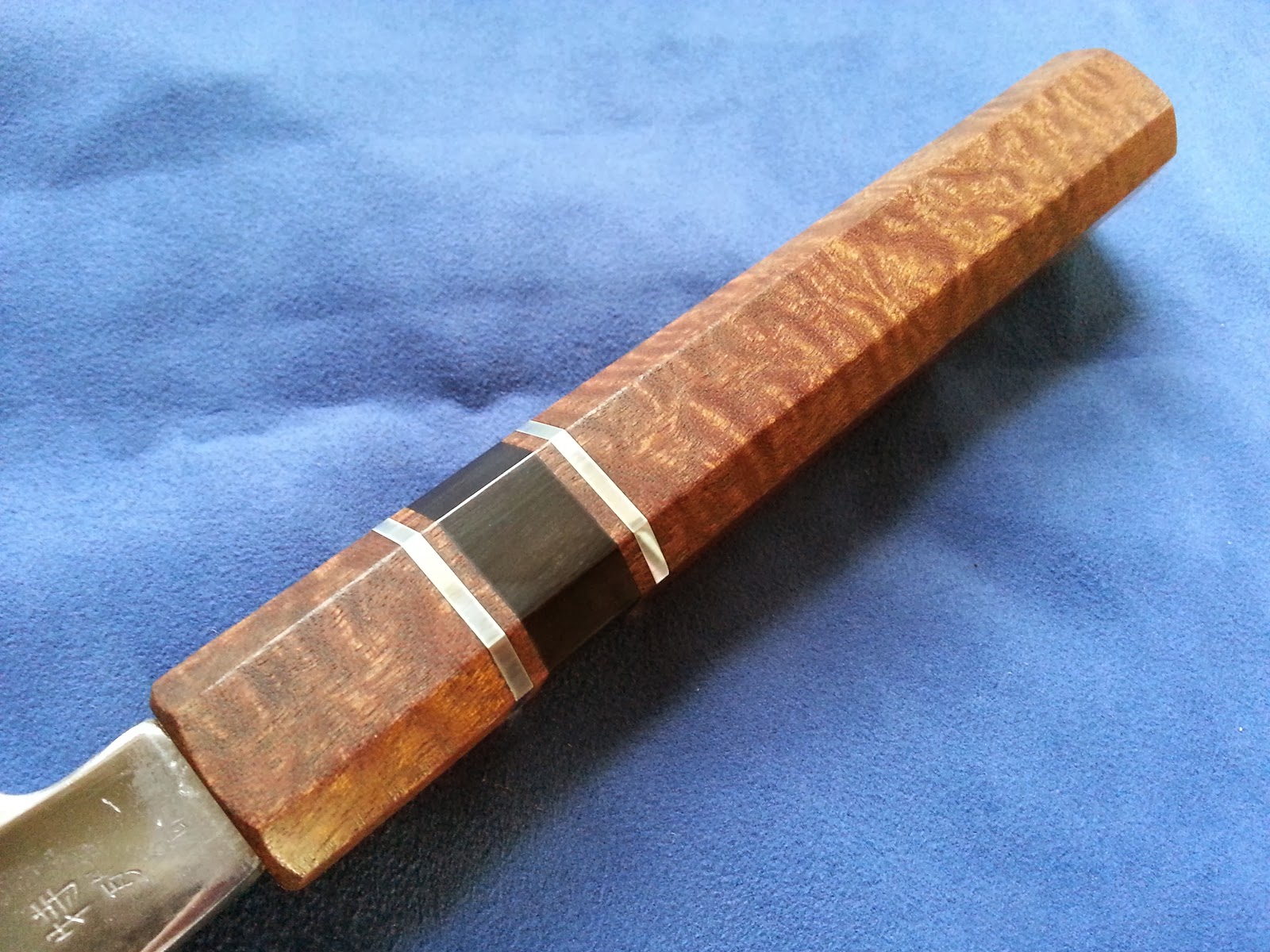 I recieved package from Sweden today with two Takeda's and some wood. I have to make new handle for 270mmm gyuto and two sayas. New handle will be made of Koa wood, spacers and musk ox horn. I have to say that I am little bit scared of that handle and I will really have to focus. Materials used are fragile and there are 3 different types of them: wood, new silver and musk ox horn. Each of them are working differently and I am worried about movement of them. This is why I want to use wooden dovel inside of handle.
