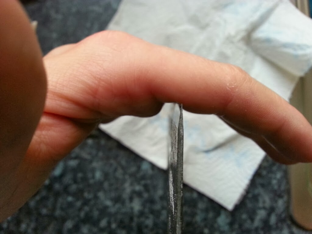 Mike was thinning some knives including my Yoshiaki Fujiwara Kato 240mm gyuto on the belt grinder. Funny fact is that the belt was very coarse like 80 or something and it was destined for wood working.
