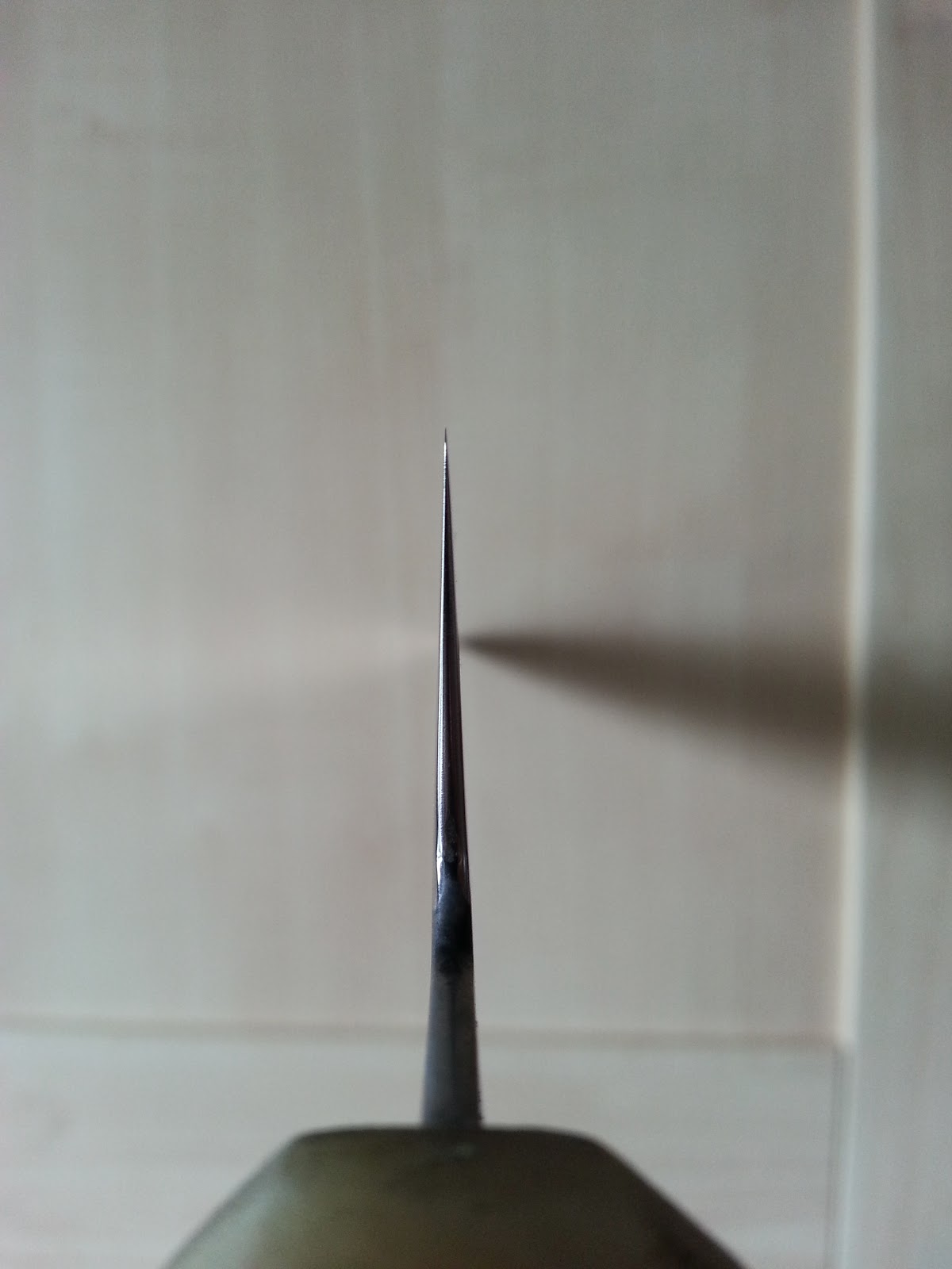 After thinning I had to mirror polish it but it was much harder than I thought. If i could do as much as possible on the stones then it could be quite easy but there was a low spot behind the heel, between flat face of the knife and bevels on the roght side. This is the reason why I had to do that with sanding paper. I thought that polishing this thing will be super easy because I've done that previously with much harder knives than this one but I was wrong. I was sanding it every day except weekends for two weeks!! Yes I know it is crazy but I always left some scratches. When I finished for the first time I've noticed that there are some etching marks and I had to do that again. When I finished with sanding paper I used my mops and polishing compounds. When I was doing that for the last time I started with 80 grit and everytime when I finished with one grit I've done scratches in opposite direction. And when I started with next one I was sanding as long as I could see scratches from previous grit and because of that I could be sure that I removed all scratches. Sounds easy. You know what?? Once again I was wrong. I got it to mirror level but it is getting new scratches super fast. Also after all this sanding and polishing I can still see some scratches and I already done 3 new very visible ones. It seems that I can't get it to perfect mirror finish because I can't make it perfect flat. I told Magnus, owner of the knife, that if he won't like it, then I'll do that all over again.